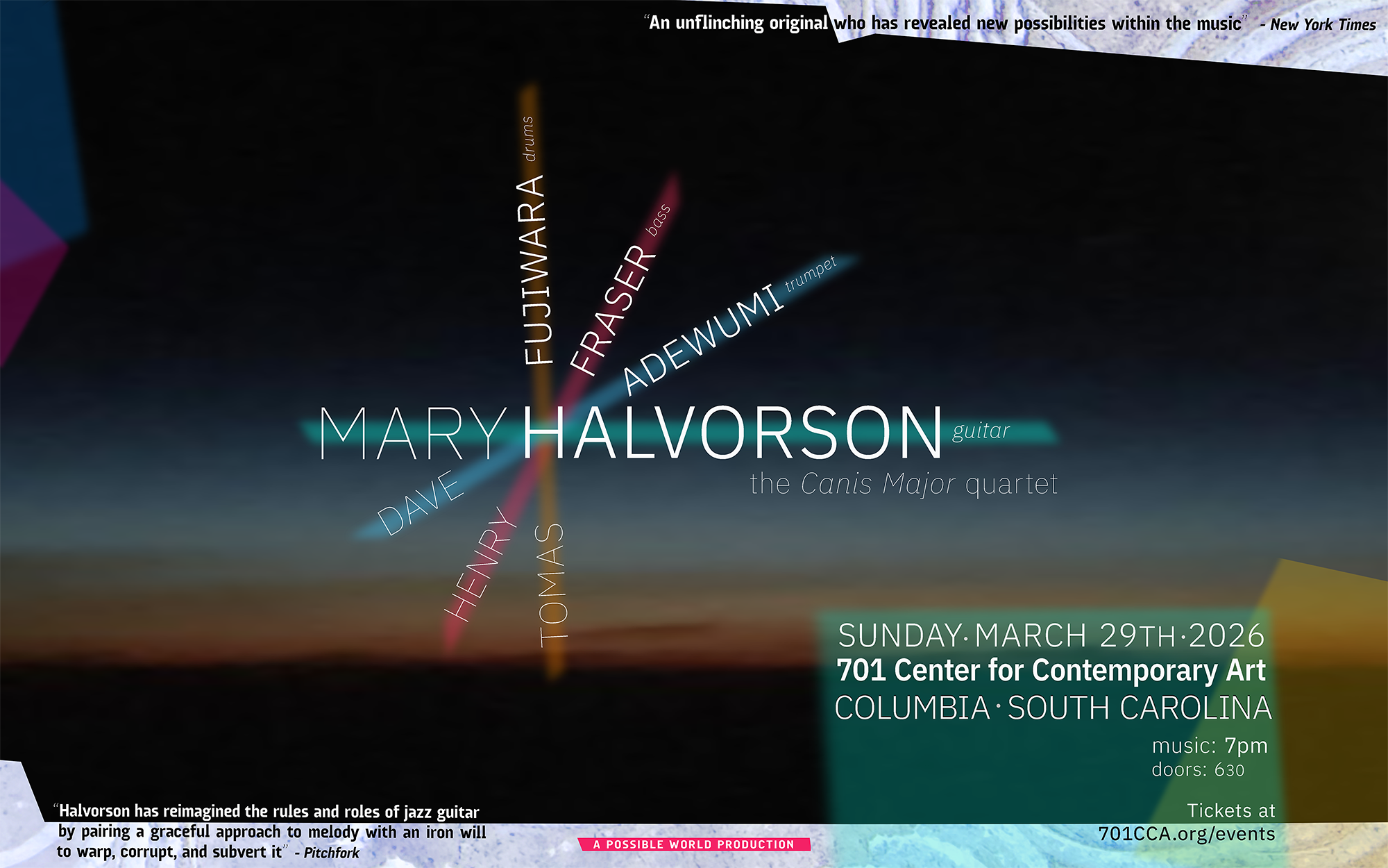 Halvorson will be bringing her group, Canis Major, to Columbia’s 701 Center for Contemporary Art the evening of Sunday, March 29th, 2026. The quartet features Halvorson alongside Dave Adewumi (trumpet), Henry Fraser (bass), and Tomas Fujiwara (drums).